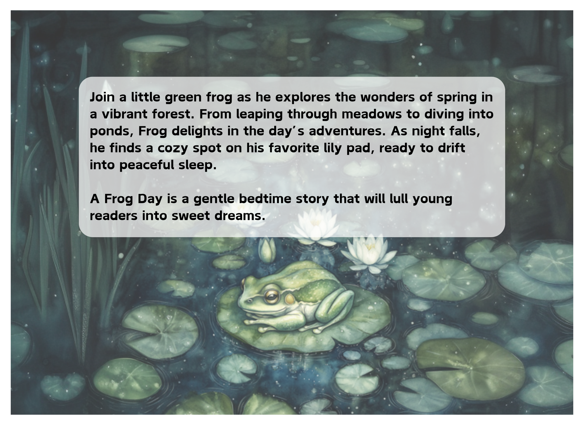 Join a little green frog as he explores the wonders of spring in a vibrant forest. From leaping through meadows to diving into ponds, Frog delights in the day’s adventures. As night falls, he finds a cozy spot on his favorite lily pad, ready to drift into peaceful sleep.